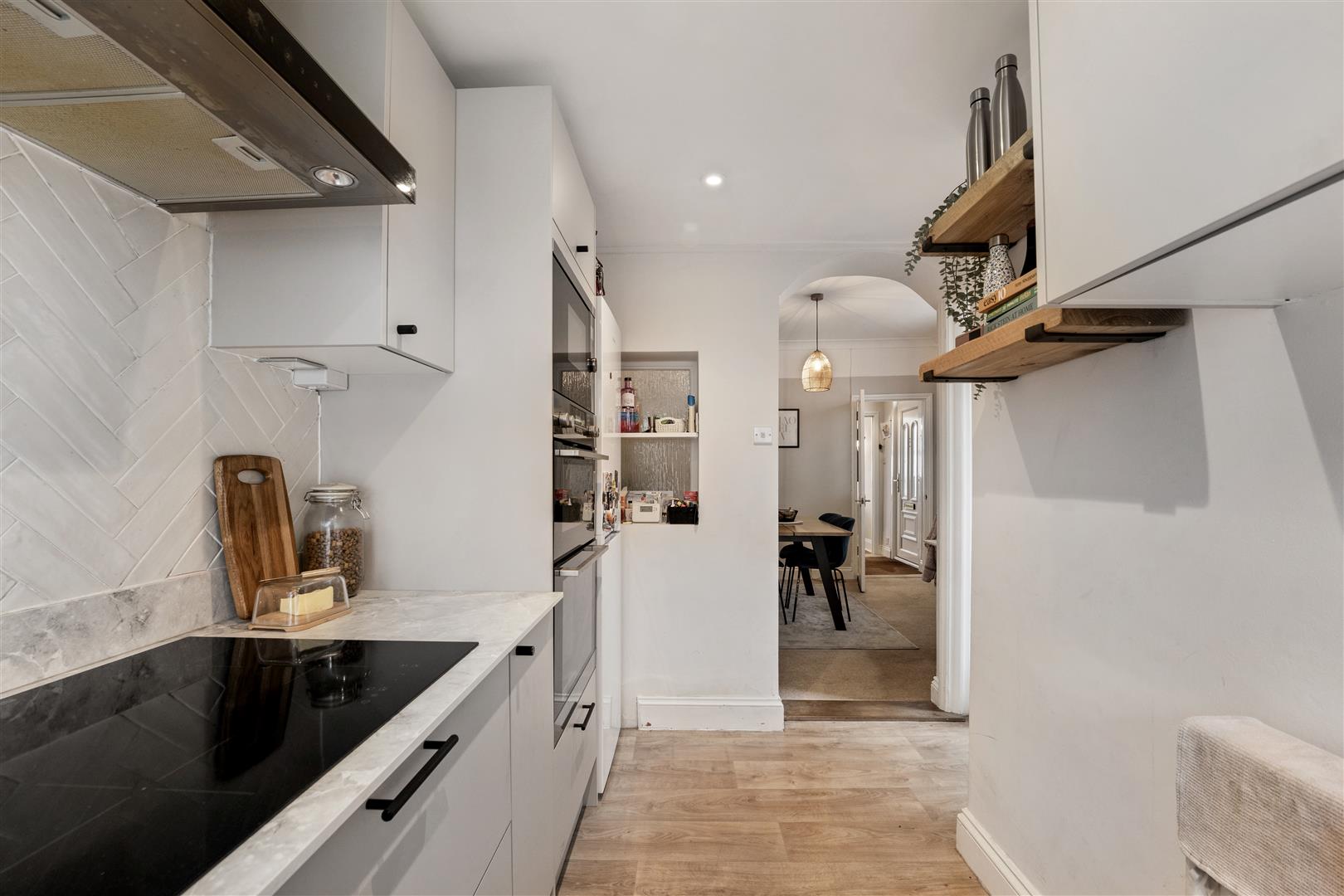 The modern fitted kitchen enjoys delightful views over the rear garden and offers a practical yet stylish space for cooking and dining. Designed with both functionality and aesthetics in mind, it forms the true heart of the home.