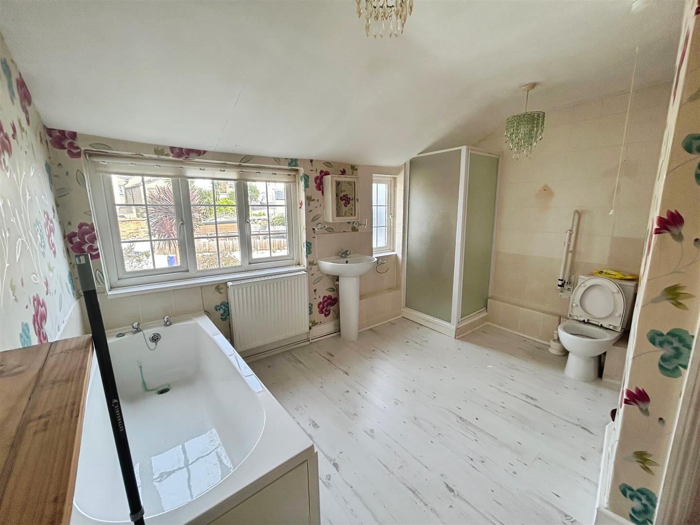 Upstairs, the property offers two generously sized double bedrooms, both filled with natural light and providing comfortable accommodation. The impressive first-floor bathroom is a true highlight, featuring both a full-size bath and a separate shower cubicle.