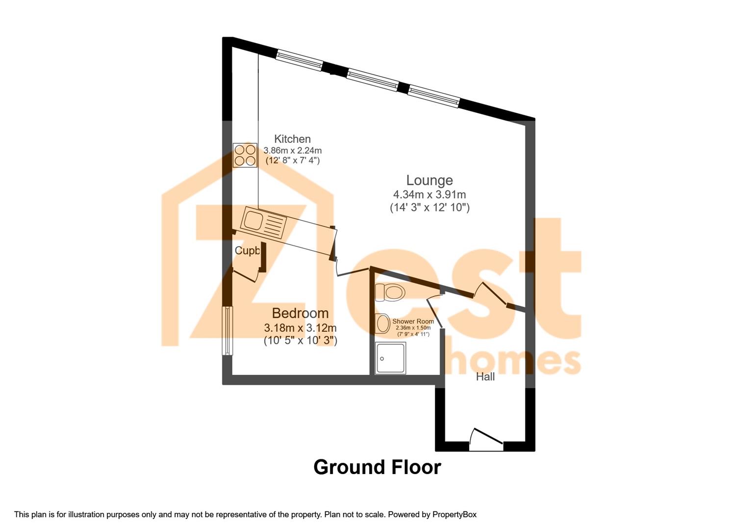 - Accommodation includes entrance hall, shower room, open-plan lounge/kitchen, and double bedroom