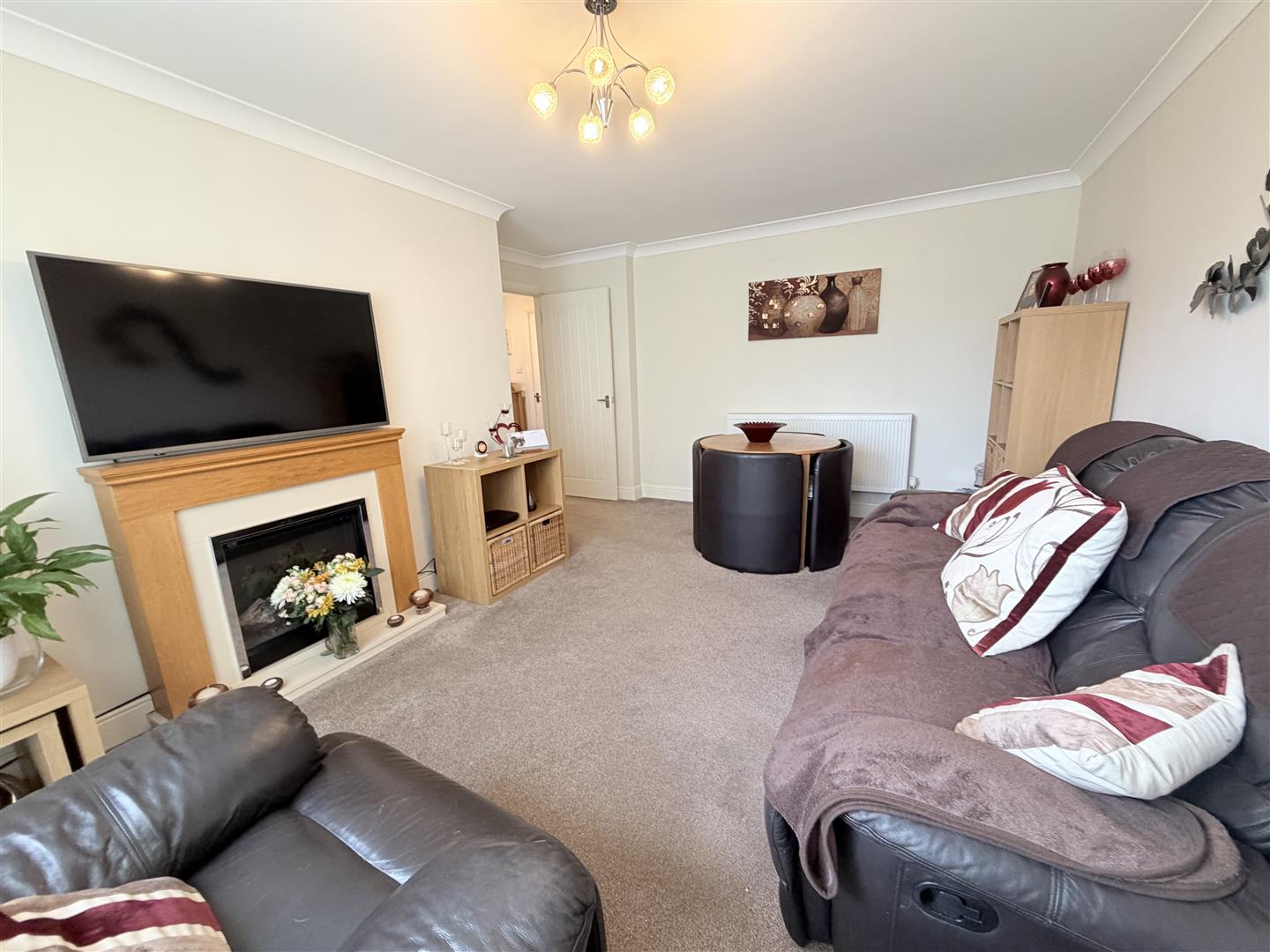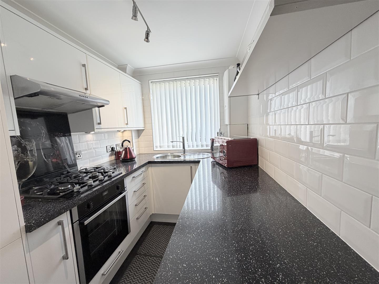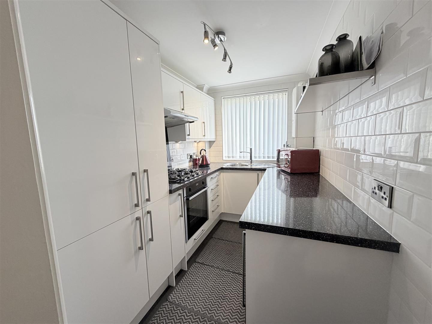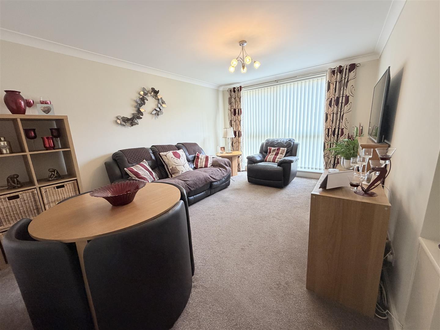 The property features a bright and spacious lounge/dining room, enhanced by a large window that floods the space with natural light, creating an inviting and comfortable living environment. The galleried kitchen is thoughtfully designed and fitted with integrated appliances, including a fridge, freezer, and wine cooler — perfect for relaxed entertaining and enjoying summer evenings.