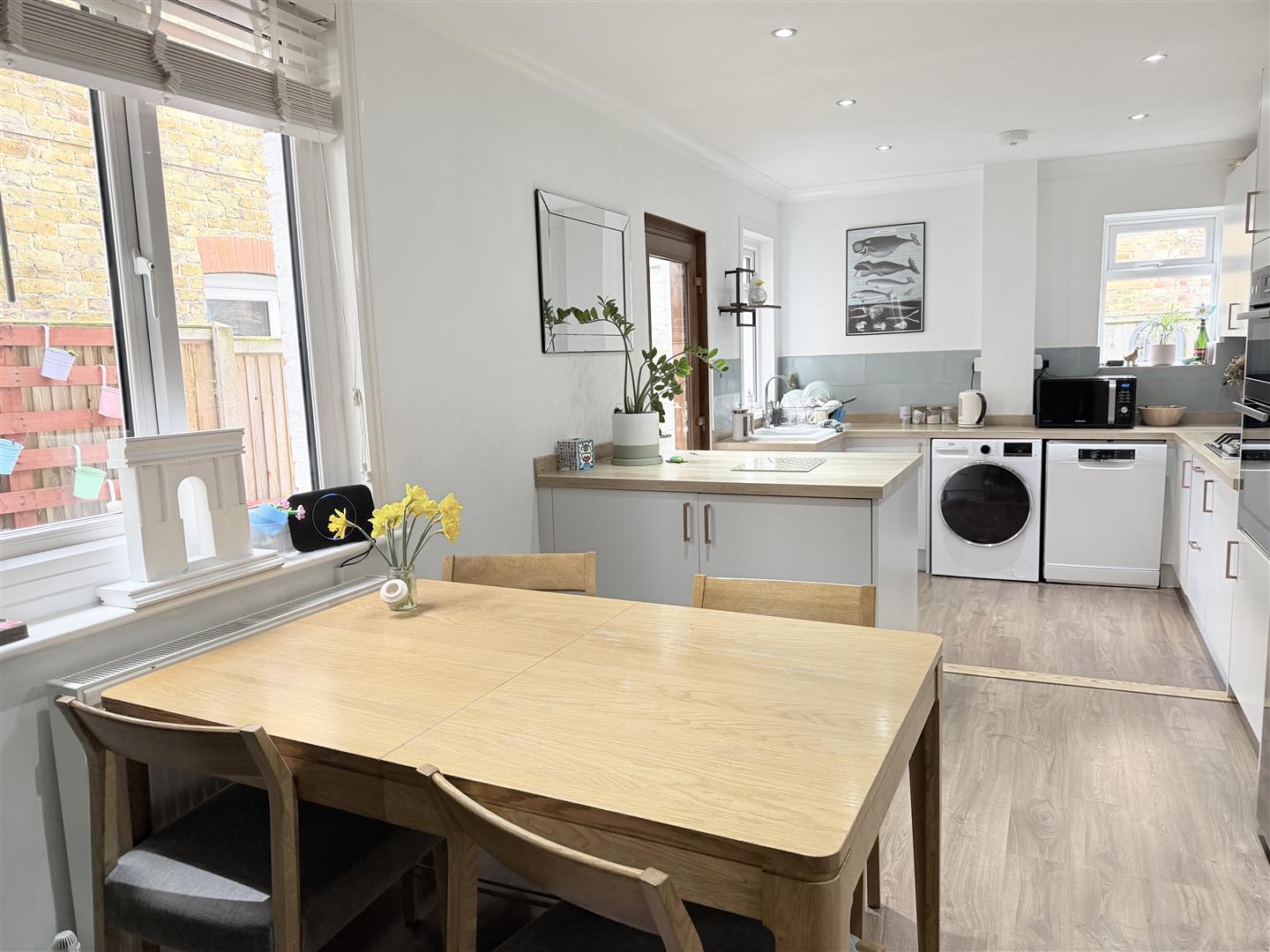 To the rear, the modern kitchen/breakfast room provides ample space for both dining and storage. A glazed door opens onto a private rear courtyard, which benefits from personal side access — perfect for enjoying outdoor relaxation or easy access for bicycles and bins.