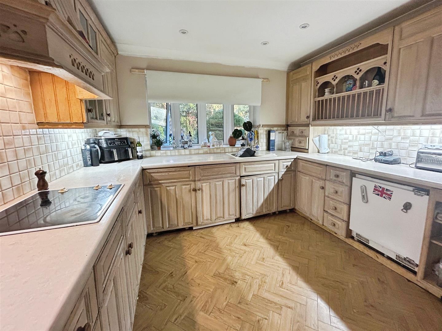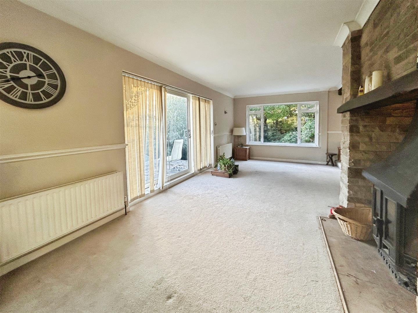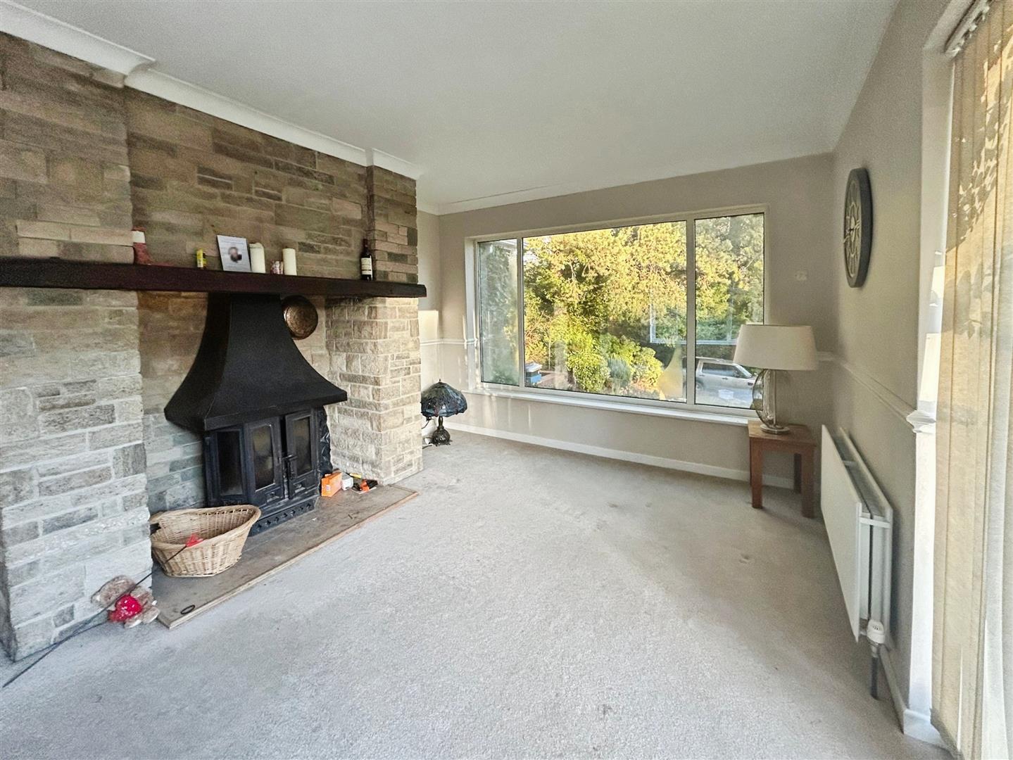 Internally, the property offers versatile and spacious accommodation. The dual-aspect lounge is a real highlight — featuring an open fire, perfect for cosy evenings in during the colder months. Large patio doors open onto an area ideally suited for reinstating a balcony, perfectly positioned to make the most of the surrounding outlook. The dining room is beautifully bright, with a large picture window framing the glorious garden views, creating an inviting space for family dining and entertaining.