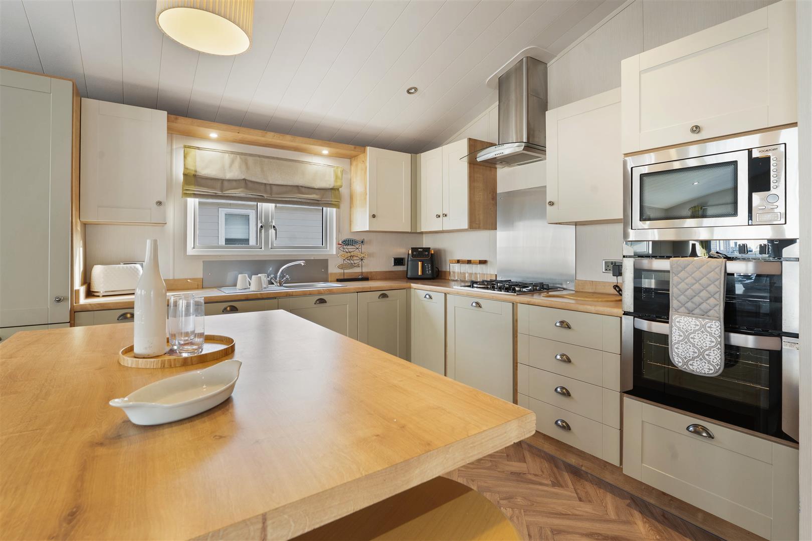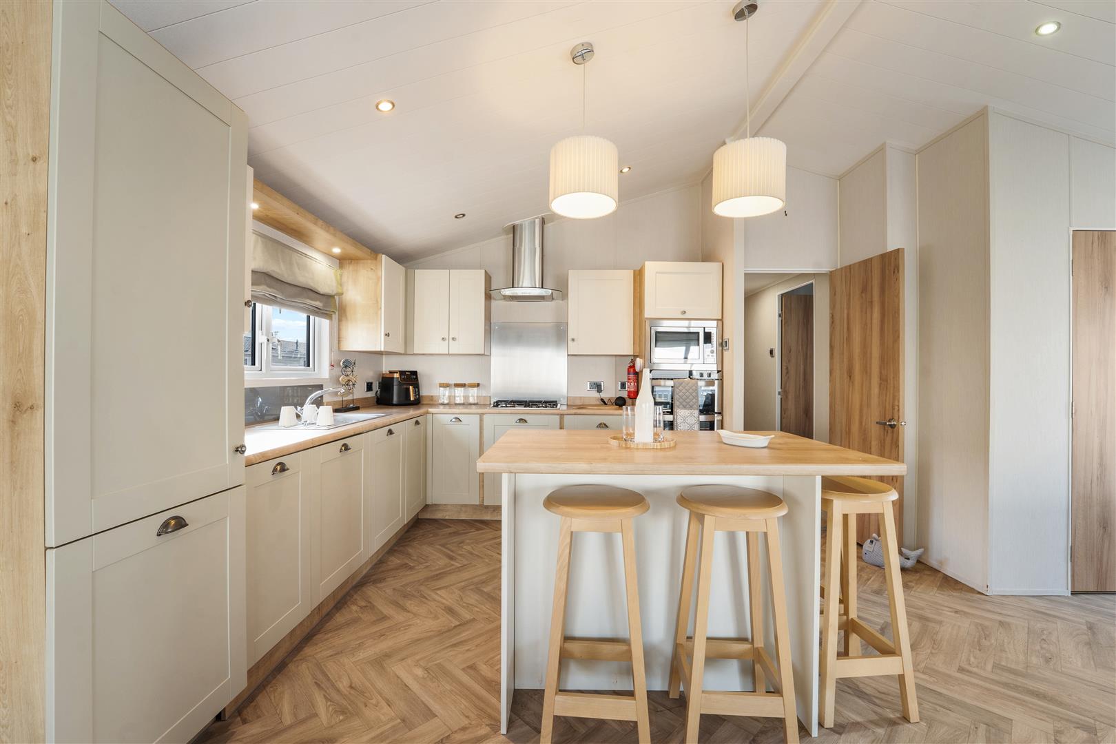 The fully integrated kitchen is a true centrepiece, complete with a kitchen island, breakfast bar, dishwasher, washing machine, fridge freezer, microwave, and cooker — blending practicality with contemporary style.