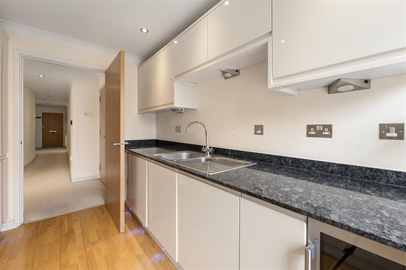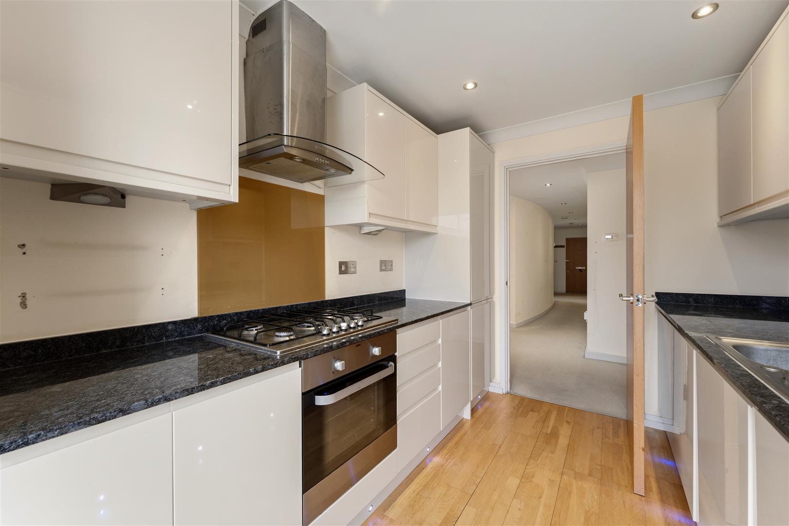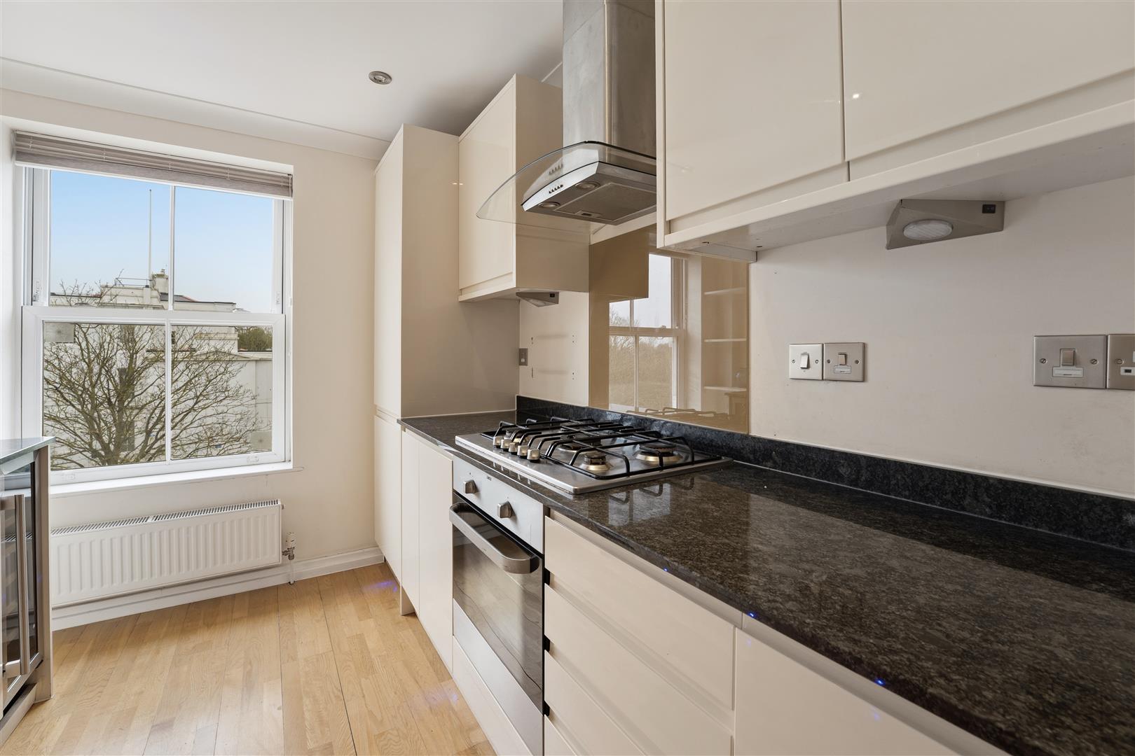 Internally, the apartment offers a bright and generous open-plan living and dining area, featuring double doors that open onto a Juliette balcony. Large windows flood the space with natural light, creating an ideal setting for both everyday living and entertaining. The contemporary kitchen is fully fitted with a high-specification range of integrated appliances, seamlessly blending style with practicality.