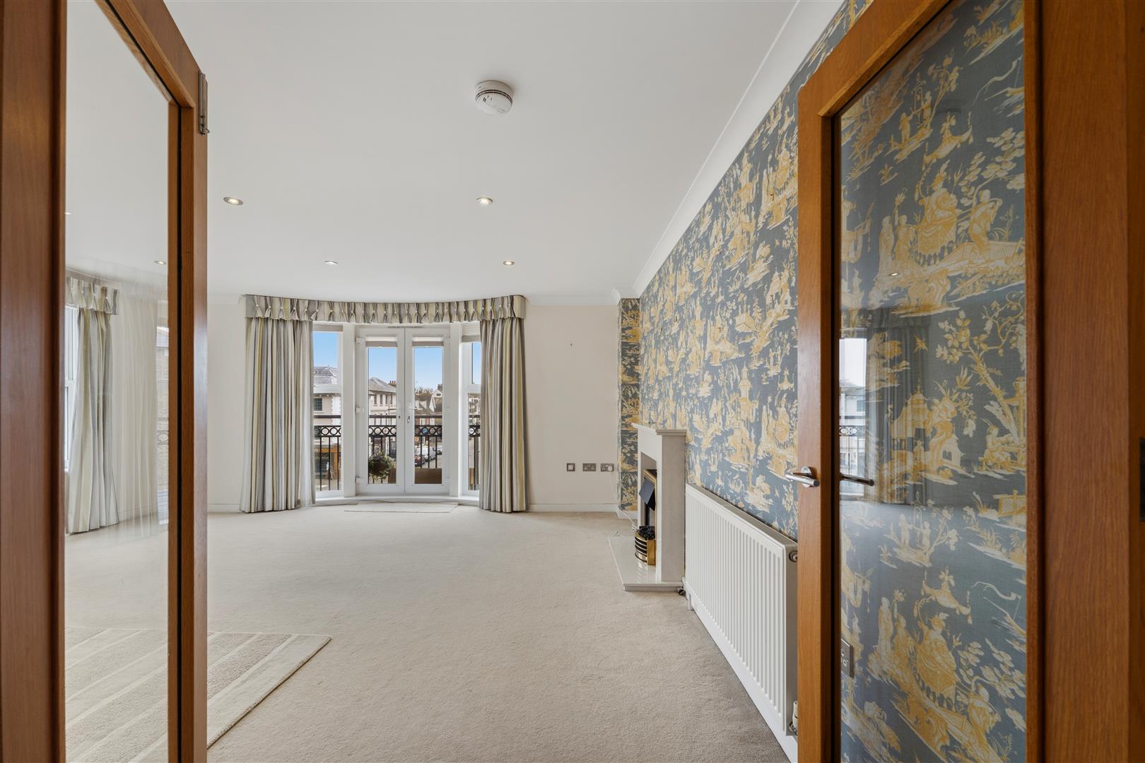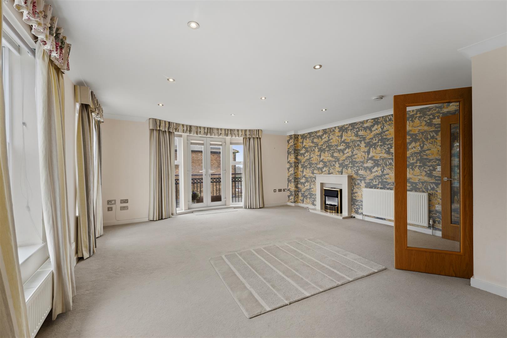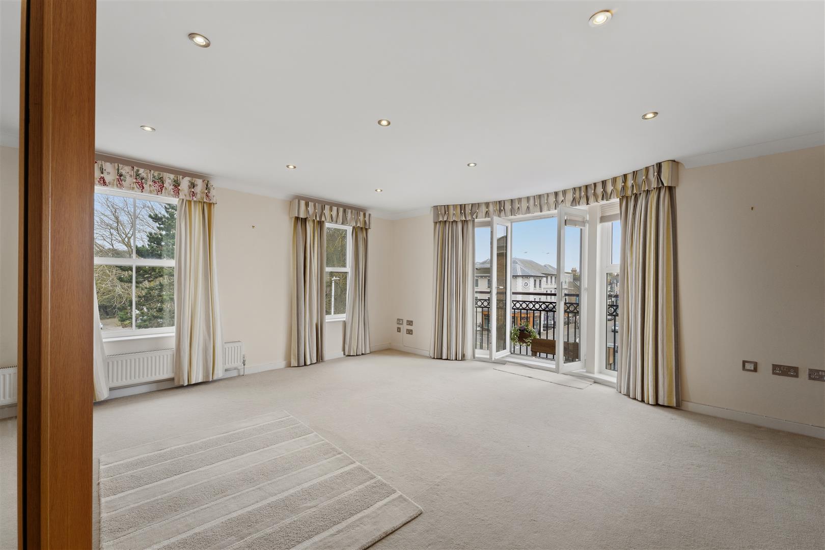 Internally, the apartment offers a bright and generous open-plan living and dining area, featuring double doors that open onto a Juliette balcony. Large windows flood the space with natural light, creating an ideal setting for both everyday living and entertaining. The contemporary kitchen is fully fitted with a high-specification range of integrated appliances, seamlessly blending style with practicality.