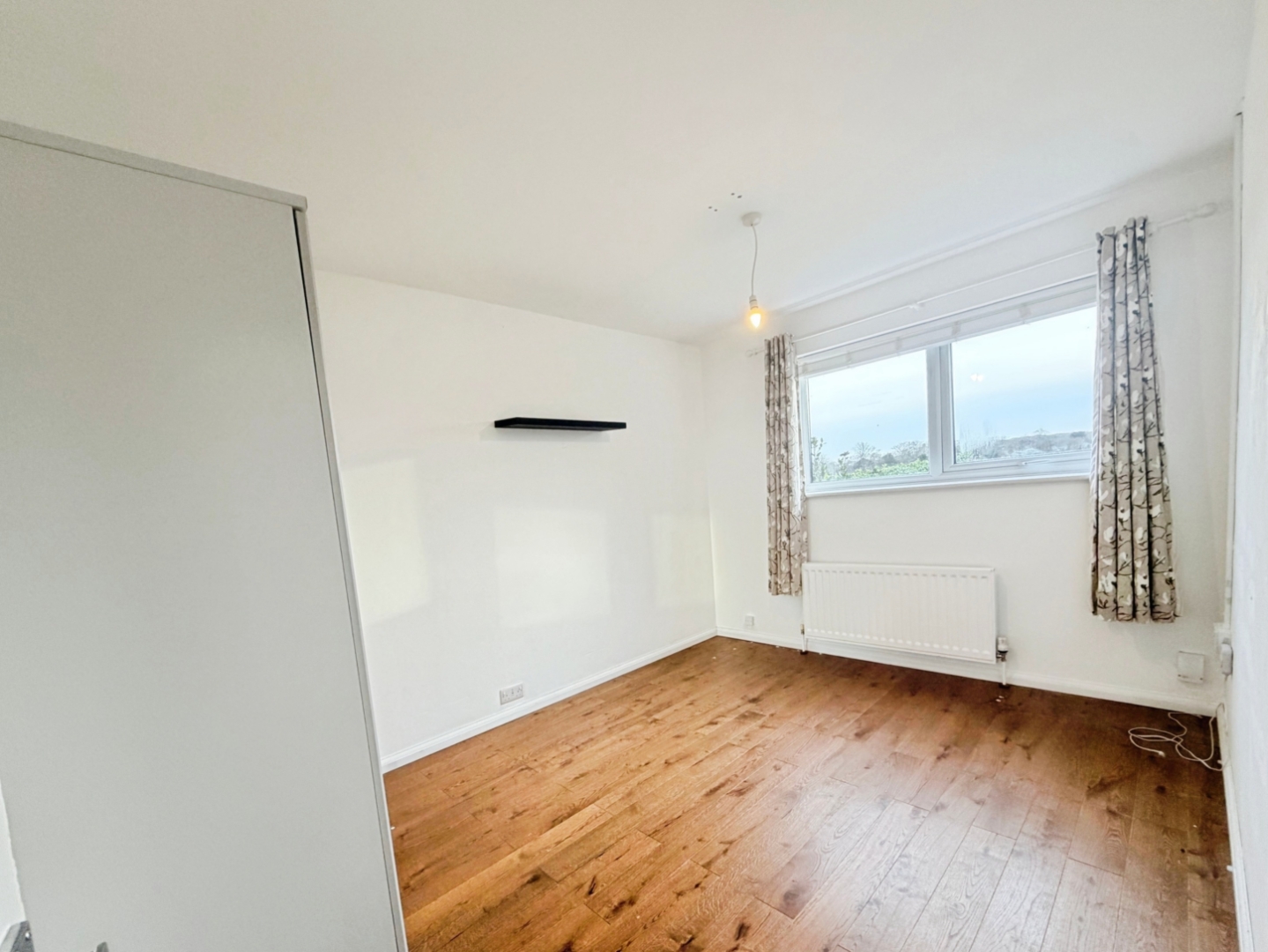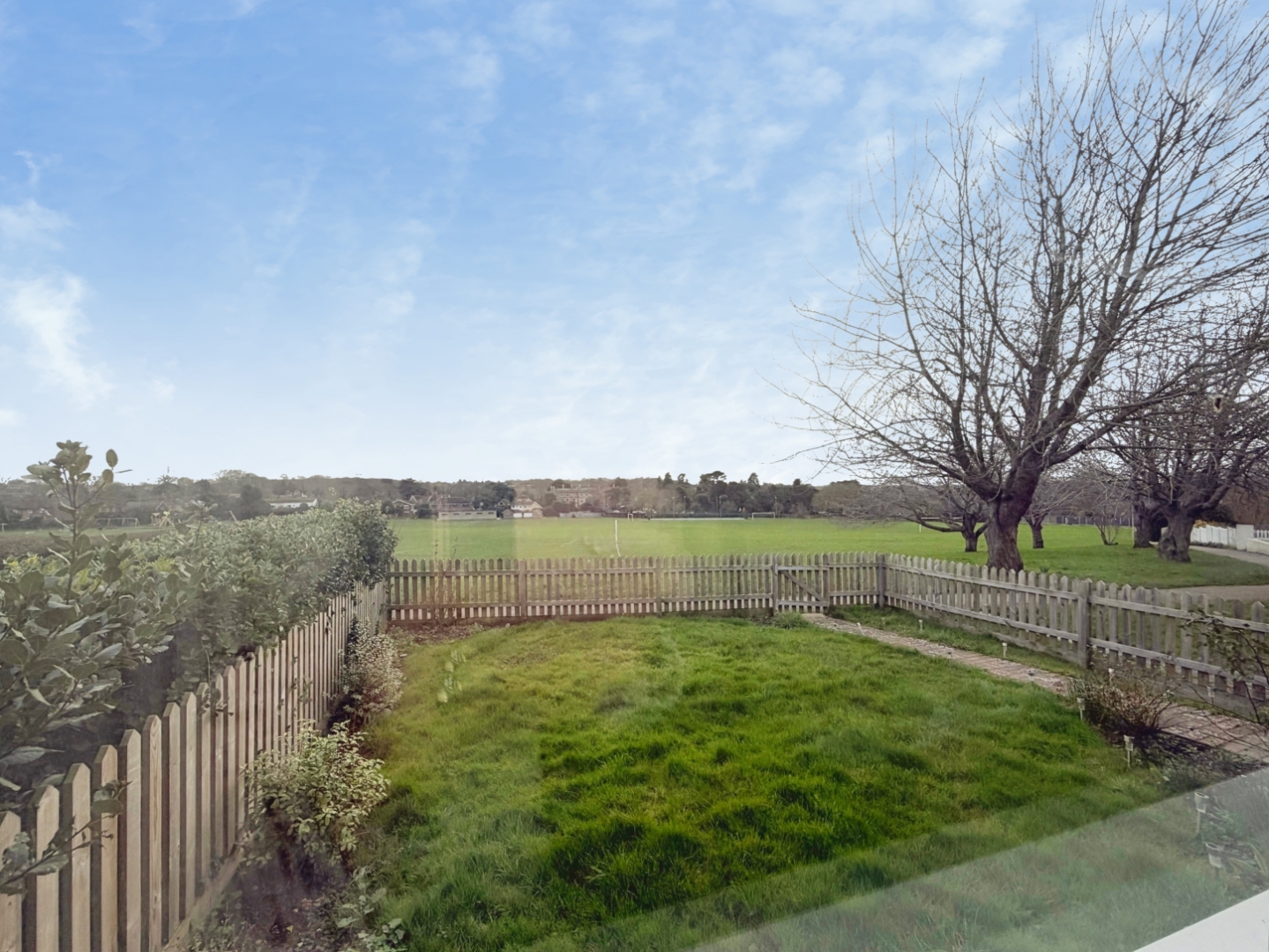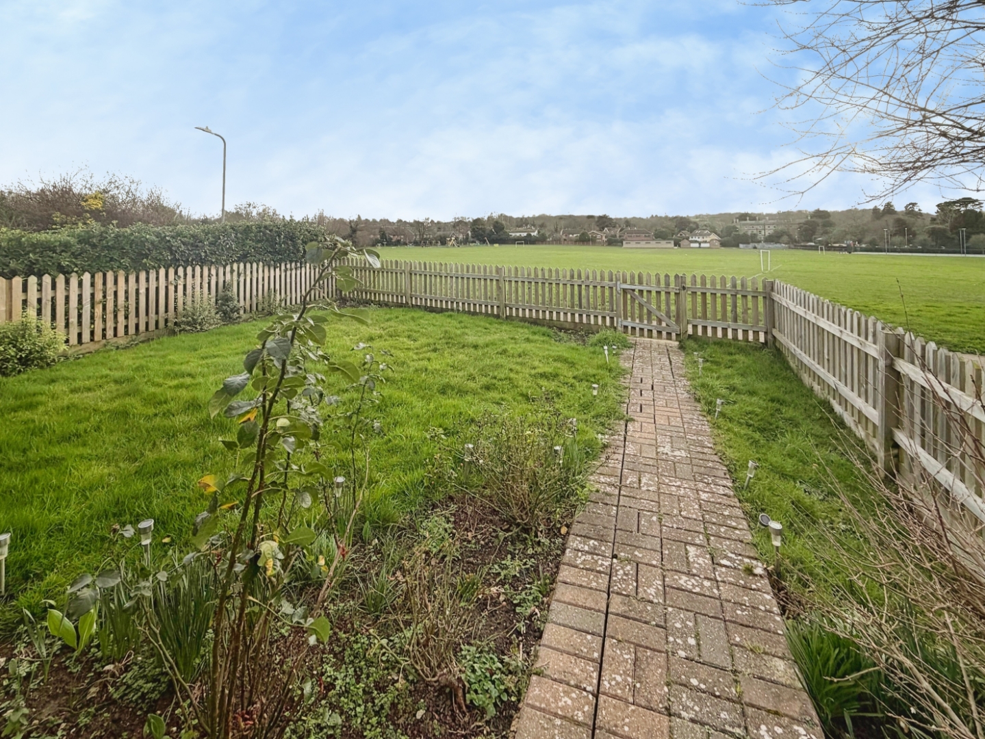 The property is accessed via a side porch leading into a welcoming hallway. At the front of the home are two spacious double bedrooms, both tastefully decorated and enjoying open views across the Cherry Orchard Playing Fields, creating a bright and relaxing atmosphere.