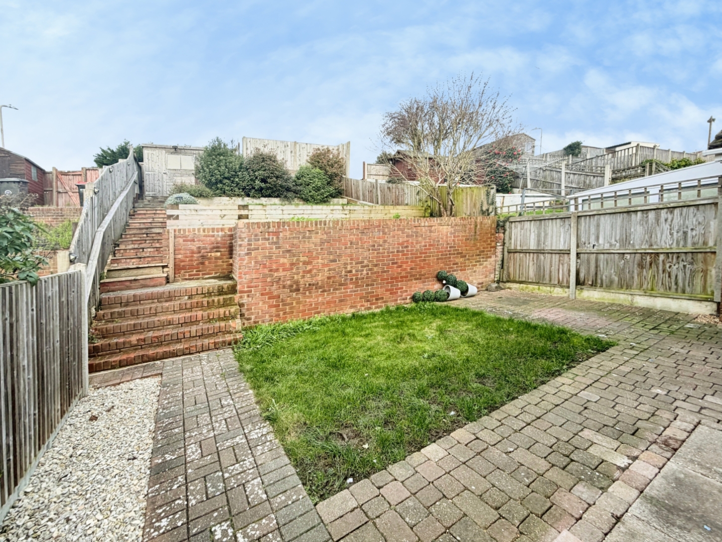 French doors open out onto a well-maintained rear garden designed to make the most of the sunlight. With a patio area, tiered landscaping, and an elevated seating space that enjoys sun throughout the day, the garden provides an ideal place to relax. The property also benefits from off-street driveway parking.